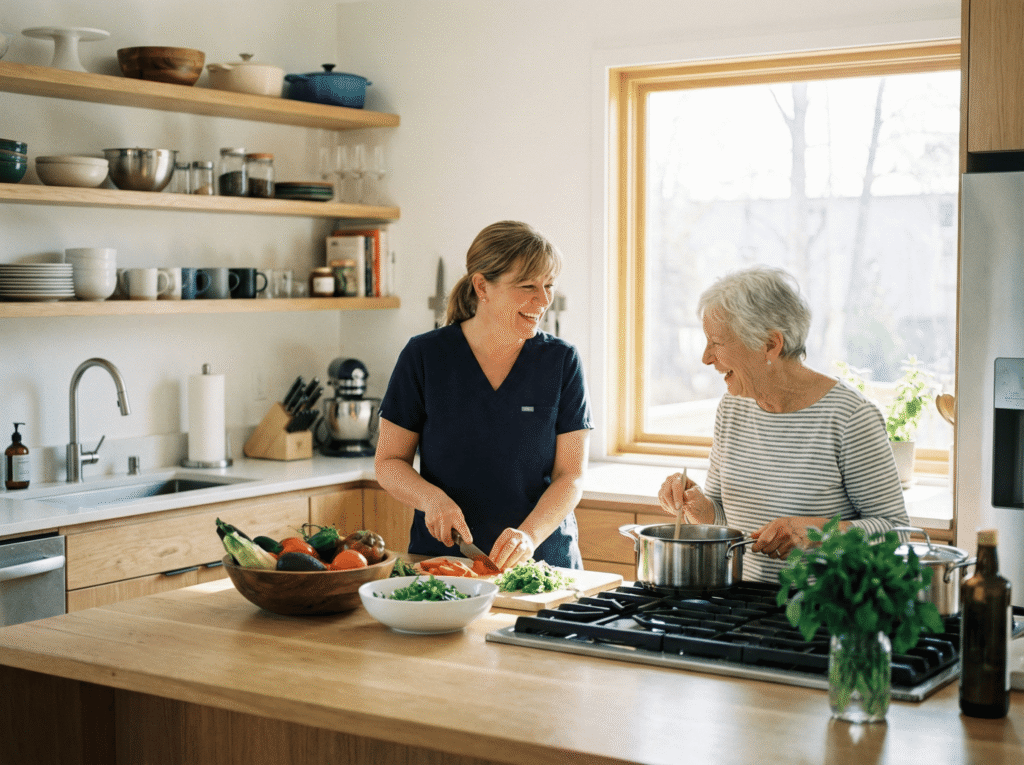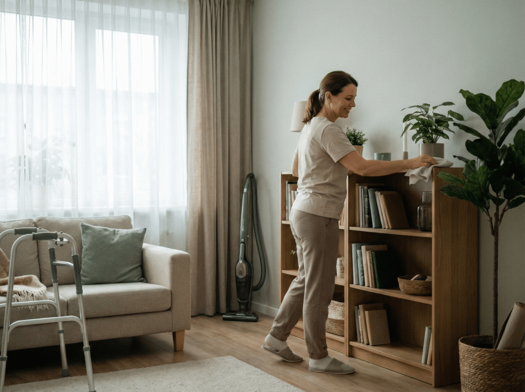 Caregivers help maintain a clean and comfortable home environment by assisting with basic household tasks such as tidying living areas, washing dishes, and keeping spaces organized.